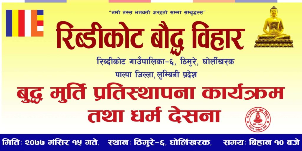 प्रमुख अतिथि भिक्षु महासंघका अध्यक्ष श्री भिक्षु मैत्री महास्थबिरको उपस्थिति रहने कार्यक्रममा नेपाल सरकार संस्कृति पर्यटन तथा नागरिक उड्डयन मन्त्रालय बौद्ध दर्शन प्रवद्र्धन तथा गुम्बा बिकास समितिका कार्यकारी सदस्य एबं विहार प्रमुख श्री भिक्षु मेधकर स्थबिर (नारायण बहादुर आले मगर) र भिक्षु ज्ञानेन्द्र ज्यूको समेत सहभागीता रहने आयोजकले जनाएका छन् । भिक्षु बाटै बुद्ध मूर्ति स्थापना गरिने र धर्मदेशना दिनु हुने समेत जनाइएको छ । कोरोना संक्रमणको जोखिमलाई मध्यनजर गर्दे नेपाल सरकारले जारी गरेको निर्देशिकाको अवलम्बन गर्दे कार्यक्रम सम्पन्न गर्ने तयारी भएको रिब्डीकोट बौद्ध विहारले जनाएको छ ।