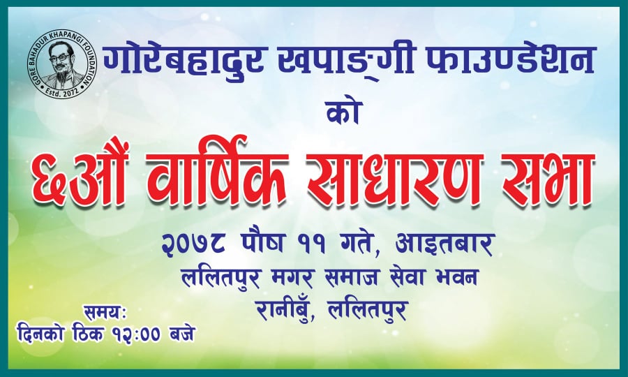 स्व. नेता खपाङ्गीकी धर्मपत्नी विद्या खपाङ्गीको शोकसभा समापनलगत्तै भोलि नै फाउण्डेशनको छैटौँ साधारणसभा ललितपुर मगर समाजसेवा भवन रानेबुँ, ललितपुरमा हुने फाउण्डेशनका अध्यक्ष हुमबहादुर पचभैया थापामगरले राज्यसत्तालाई जानकारी गराएका छन् ।