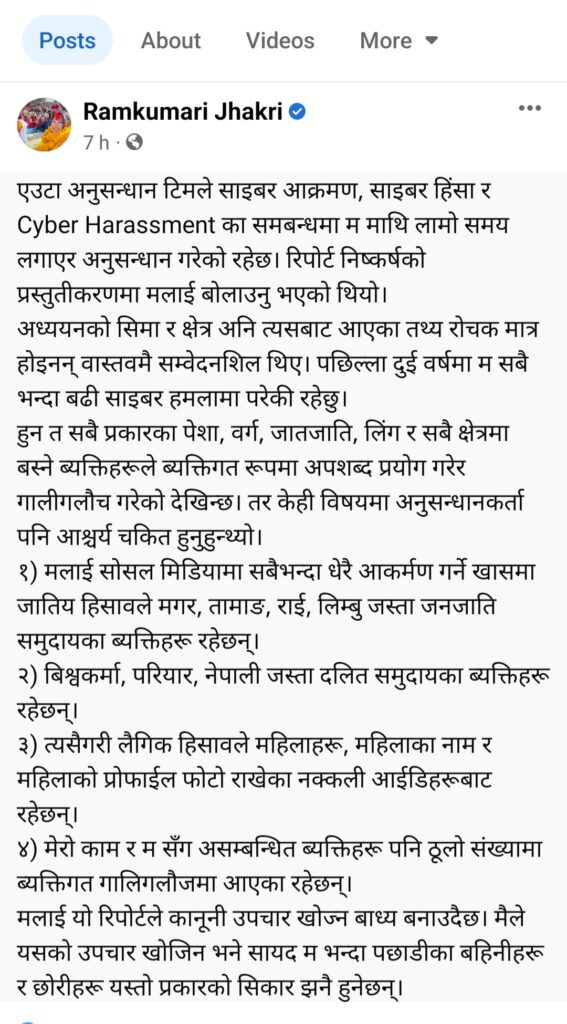 राम कुमारी झाँक्री पछिल्लो दुई वर्एषमा बढि साईबर हमलामा परेकि जनाएकि छिन् । उनलाई बढि हमला गर्नेमा सबै प्रकारका पेशा, वर्ग, जातजाति, लिंग र सबै क्षेत्रमा बस्ने ब्यक्तिहरू रहेकाे र ब्यक्तिगत रूपमा अपशब्द प्रयोग गरेर गालीगलौच गरेको देखिएकाे छ । उनलाई साेसल मिडियामा सबैभन्दा धेरै आकर्मण गर्ने खासमा जातिय हिसावले मगर, तामाङ, राई, लिम्बु जस्ता जनजाति समुदायका ब्यक्तिहरू र बिश्वकर्मा, परियार, नेपाली जस्ता दलित समुदायका ब्यक्तिहरू रहेकाे जनाएकि छिन् । एउटा अनुसन्धान टिमले साइबर आक्रमण, साइबर हिंसा र Cyber Harassment का समबन्धमा उनि माथि लामो समय लगाएर अनुसन्धान गरेको बुझिएको छ । लैगिक हिसावले महिलाहरू, महिलाका नाम र महिलाको प्रोफाईल फोटो राखेका नक्कली आईडिहरूबाट पनि झाँक्रीलाई साईबर आक्रमण गरेकाे बताएकि छिन् । उनिसँग असम्बन्धित ब्यक्तिहरू पनि ठूलो संख्यामा ब्यक्तिगत गालिगलौजमा आएका बताएकी छिन् । यो रिपोर्टले उनलाई कानुनी उपचार खोज्न बाध्य भएको बताएकी छिन् । उनले यसको उपचार खोजेमा उनि भन्दा पछाडीका बहिनीहरू र छोरीहरू यस्तो प्रकारको सिकार नहुने उनकाे विश्वास छ ।