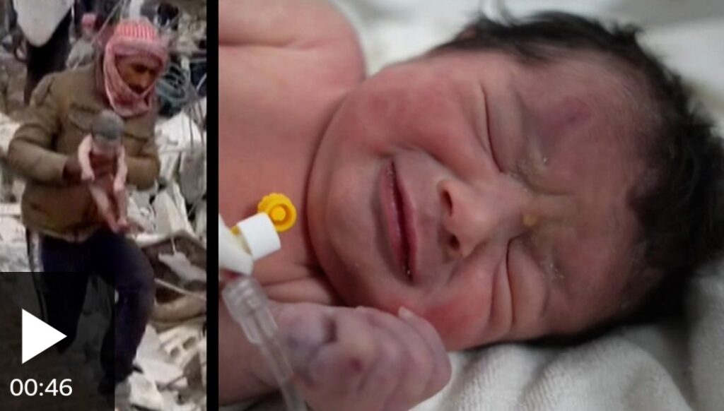 उत्तरी सिरियामा साेमबार आएको ७.८ रेक्टरकाे भुकम्पले भत्काइदिएको एउटा घरमा एक नवजात शिशु फेला परेकी छन्। नवजात शिशु फेला पर्दा उनको नाभी आमाको शरीरसँग जोडिएको थियो । तर आमाको भने मृत्यु भइसकेको अवस्था थियो