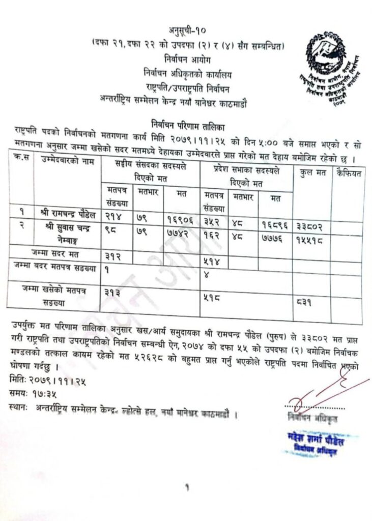 राष्ट्रपति र उपराष्ट्रपति निर्वाचन अधिकृत महेश शर्मा पौडलले घोषणा गरेको मतपरिणाम अनुसार रामचन्द्र पौडेलले ३३ हजार ८ सय २ मतभार प्राप्त गरे विजयी भए भने उनका प्रतिस्पर्धी शुभाष नेम्वाङले १५ हजार ५ सय १८ मतभार प्राप्त गरे ।
