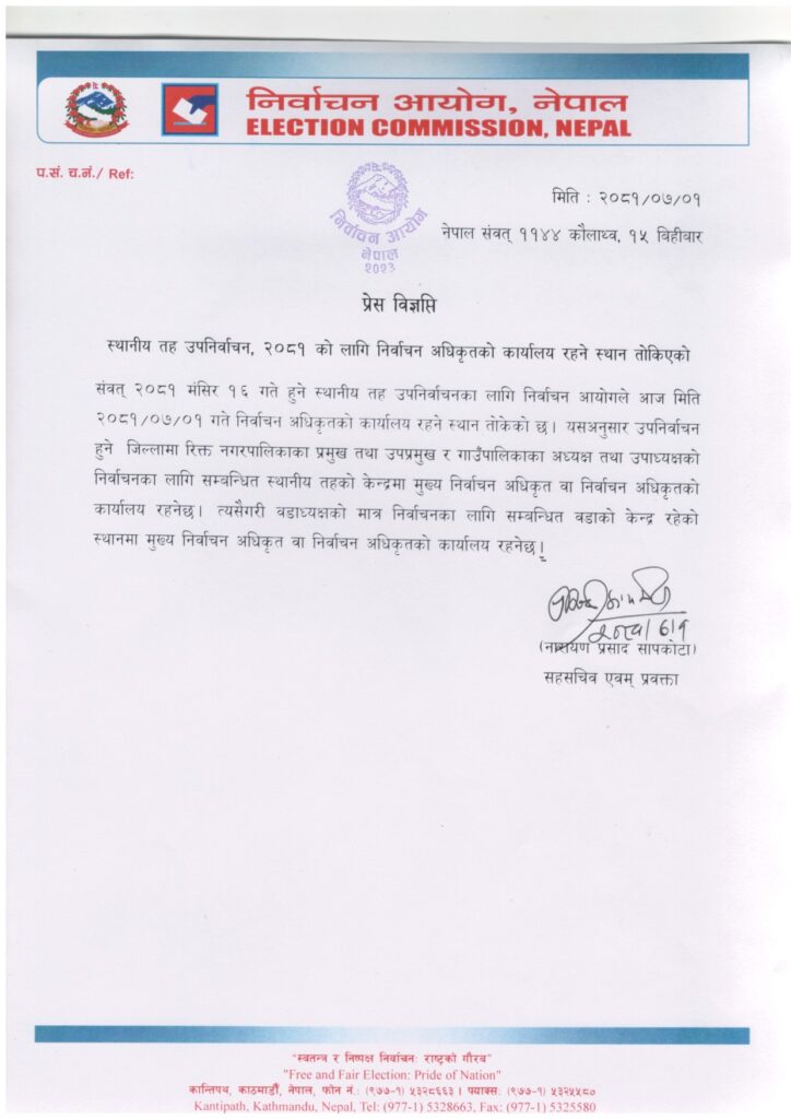 स्थानीय तह उपनिर्वाचन, 2081 को लागि निर्वाचन अधिकृतको कार्यालय रहने स्थान तोकिएको