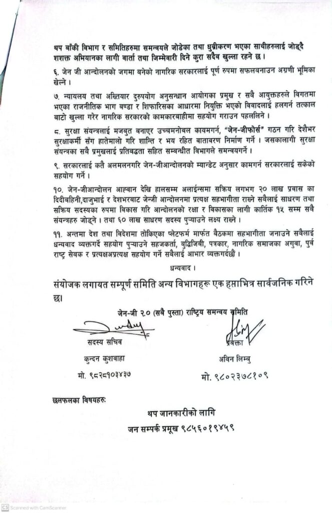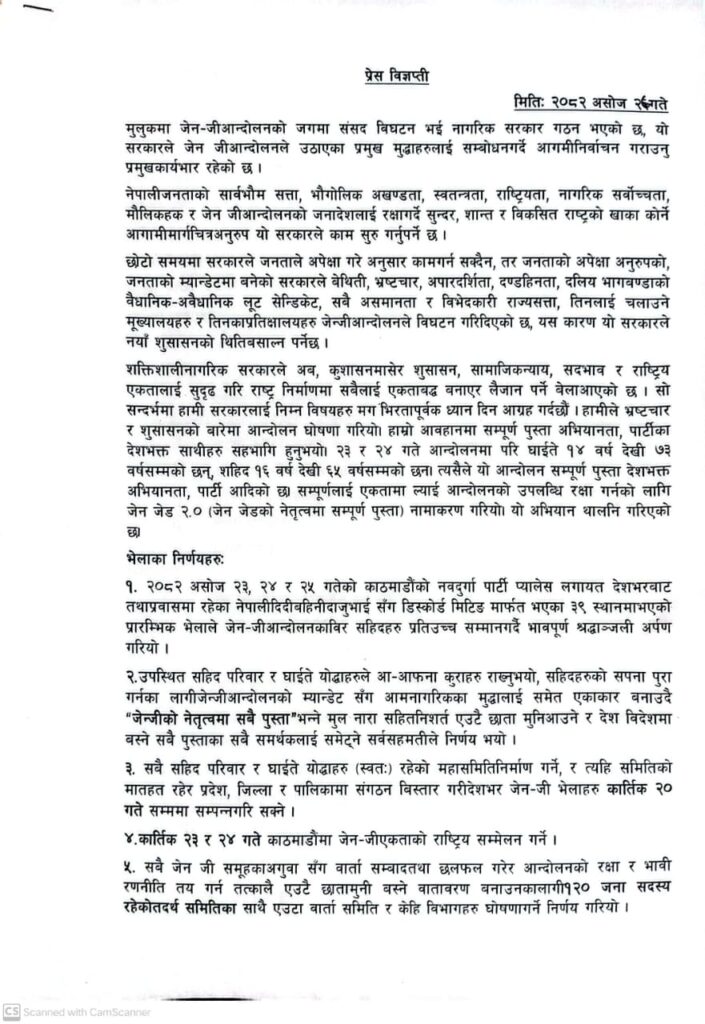 मुलुकमा जेनजी आन्दोलनको जगमा संसद विघटन भई नागरिक सरकार गठन भएको छ, यो सरकारले जेन जीआन्दोलनले उठाएका प्रमुख मुद्धाहरुलाई सम्बोधन गर्दै आगमी निर्वाचन गराउनु प्रमुख कार्यभार रहेको छ, वितरित विज्ञप्तिमा भनिएको छ ।