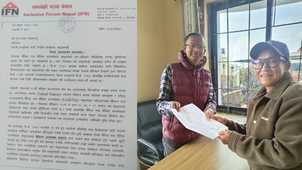 समलिङ्गी तेस्राेलिंगी लैङ्गिक तथा यौनिक अल्पसङ्ख्यक व्यक्तिहरूको हक अधिकारमा काम गर्दै आएको बद्री पुन कार्यरत समावेशी मञ्च नेपालले चितवन क्षेत्र नम्बर ३ की उम्मेदवार रेनु दाहाललाई ध्यानाकर्षण पत्र बुझायो। मञ्चले बुधवार पुष्प कमल दाहाल प्रचण्डलाई सम्बोधन गरेर ध्यानाकर्षण पत्र बुझाएको छ। घोषणापत्र संशोधन गरी “लैङ्गिक तथा यौनिक अल्पसङ्ख्यक समुदाय” स्पष्ट उल्लेख गर्न माग गरिएको छ।
